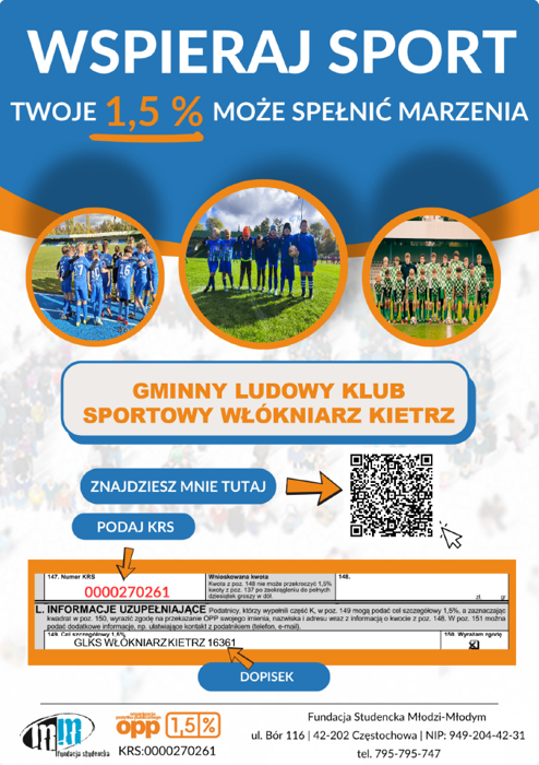 notes Przekaż 1.5% podatku na Włókniarz! 💙🤍💚 Chcemy rozwijać sport w Kietrzu oraz okolicy, by dzieci, młodzież i dorośli mieli możliwość aktywnego uczestnictwa w piłce nożnej - bez wz...